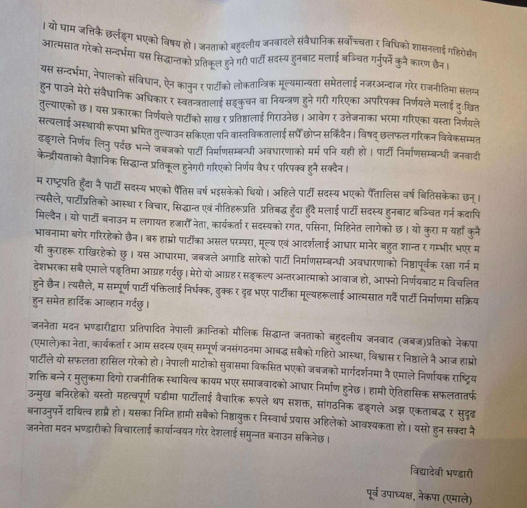 २ पृष्ठ लामो आफ्नो वक्तव्यमा उनले भनेकी छिन्, ‘म नेकपा एमालेको पार्टी जीवनमा पुनस् आएँ । म ३५ वर्ष पार्टी सदस्य भएपछि राष्ट्रपतिको शपथ खाएको हुँ । मैले पार्टी त्यागेर गएको होइन ।’