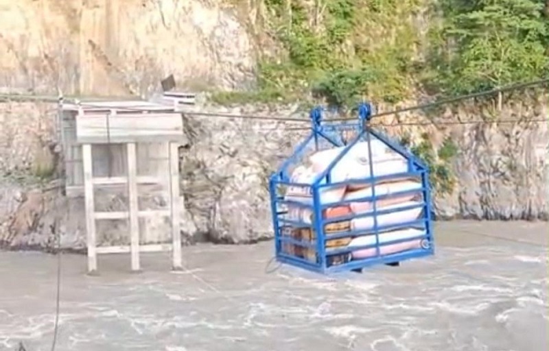 बाढीले फोक्सिङटारको मोटरेबल पुल बगाएपछि सामान ढुवानी गर्न घिर्नी
