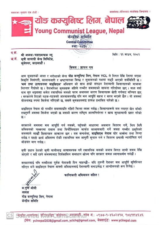 वाइसीएलले सरकारले रासायनिक मल पहुँचको आधारमा वितरण गरेको भन्दै यस्ता कार्य अविलम्व रोकेर आपूर्ति सुचारु गर्न माग गरेको छ।