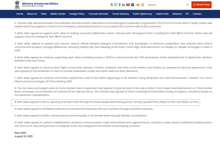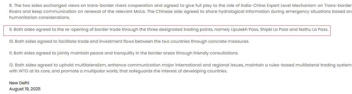 यसै सन्दर्भमा भारतको भ्रमणमा रहेको चिनिया विदेश मन्त्री र उनका समकक्षी बीचको वार्तापछि जारी गरिएको समझदारीको नवौँ बुँदामा लिपुलेक, शिप्की ला पास र नाथुला पास नाका व्यापारिक प्रयोजनका लागि पुनः सञ्चालनमा ल्याउने उल्लेख गरिएको छ ।