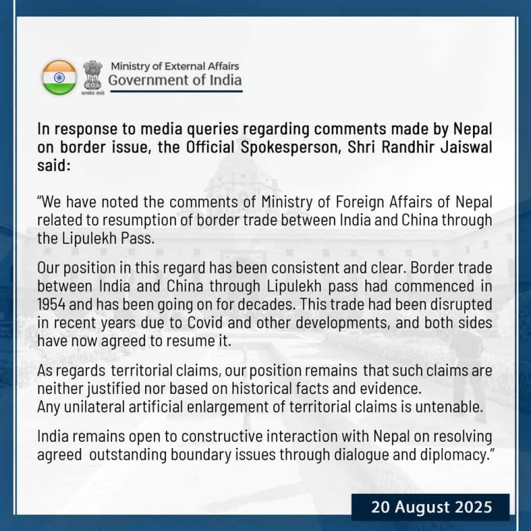 उनले यस विषयमा भारतको धारणा स्पष्ट र निरन्तर रहँदै आएको उल्लेख गरेका छन् । ‘भारत र चीनबीच लिपुलेक मार्ग हुँदै हुने सीमा व्यापार सन् १९५४ मा सुरु भएको थियो र दशकौँदेखि चल्दै आएको छ। यो व्यापार पछिल्ला वर्षहरूमा कोभिड र अन्य कारणले अवरुद्ध भएको थियो । दुवै पक्षबीच सहमति भएपछि यसलाई पुनः सुरु गर्ने निर्णय गरिएको हो,’ विज्ञप्तिमा छ ।