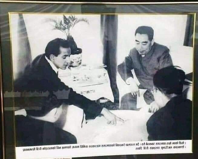 सन् १९६० मा चीन भ्रमणका बेला प्रधानमन्त्री बीपी कोइरालाले चीनका प्रधानमन्त्री चाउ एन लाइसँग सगरमाथा सीमा विवादबारे नक्सा देखाउँदै गरेको वार्ताको तस्बिर| मार्च १८ मा बीपी र माओबीच भएको शिखर बैठकबाट विवाद समाधान भएपछि बेइजिङमा नै मार्च २१ मा सीमा सम्झौतामा हस्ताक्षर गरिएको थियो|