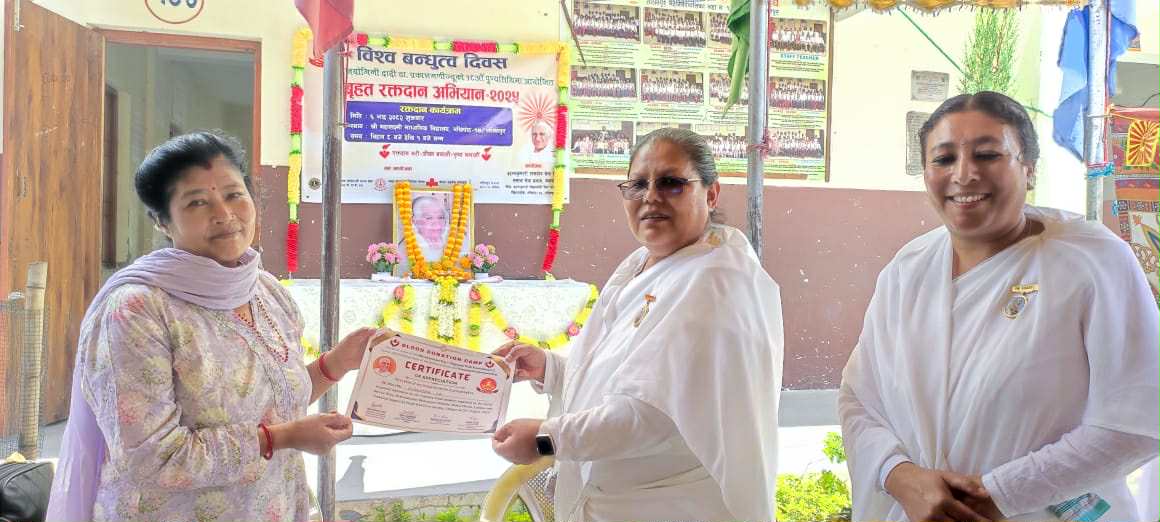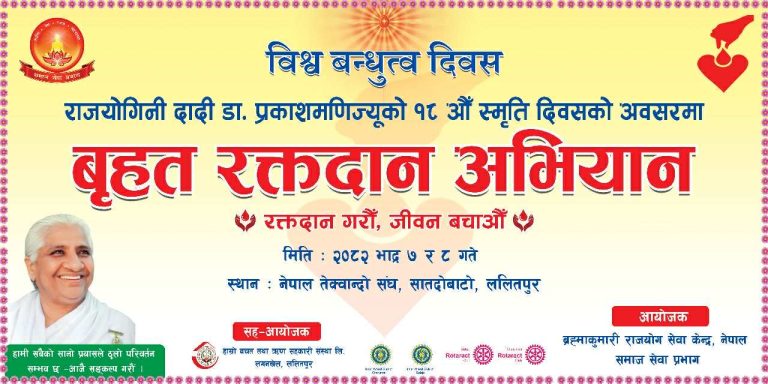 दादी प्रकाशमणीजीको १८औं पुण्यतिथि तथा विश्व बन्धुत्व दिवसको अवसरमा नेपाल र भारतमा गरी एक लाख युनिट रक्त संकलन गर्ने उद्देश्यका साथ आजदेखि रक्तदान कार्यक्रम सुरु भएको हो । रक्तदान कार्यक्रम भदौ ९ गतेसम्म सञ्चालन हुनेछ ।