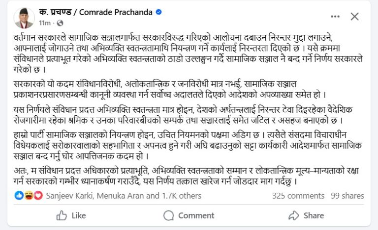 सरकारले बन्द गराएको भनिएको फेसबुकमा पूर्वप्रधानमन्त्री प्रचण्डले लेखेका छन्, ‘वर्तमान सरकारले सामाजिक सञ्जालमार्फत सरकारविरुद्ध गरिएको आलोचना दबाउन निरन्तर मुद्दा लगाउने, आफ्नालाई जोगाउने तथा अभिव्यक्ति स्वतन्त्रतामाथि नियन्त्रण गर्ने कार्यलाई निरन्तरता दिएको छ । यसै क्रममा संविधानले प्रत्याभूत गरेको अभिव्यक्ति स्वतन्त्रताको ठाडो उल्लंघन गर्दै सामाजिक सञ्जाल नै बन्द गर्ने निर्णय सरकारले गरेको छ ।’