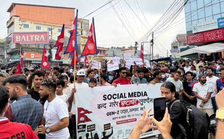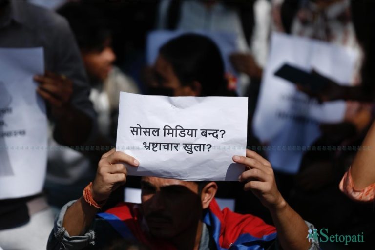 राष्ट्रिय झण्डासहित सडकमा उत्रिएका युवाहरुले ‘सामाजिक सन्जाल बन्द गरेर भ्रष्टाचार लुक्दैन’ लेखिएको ब्यानर बोकेका छन् ।