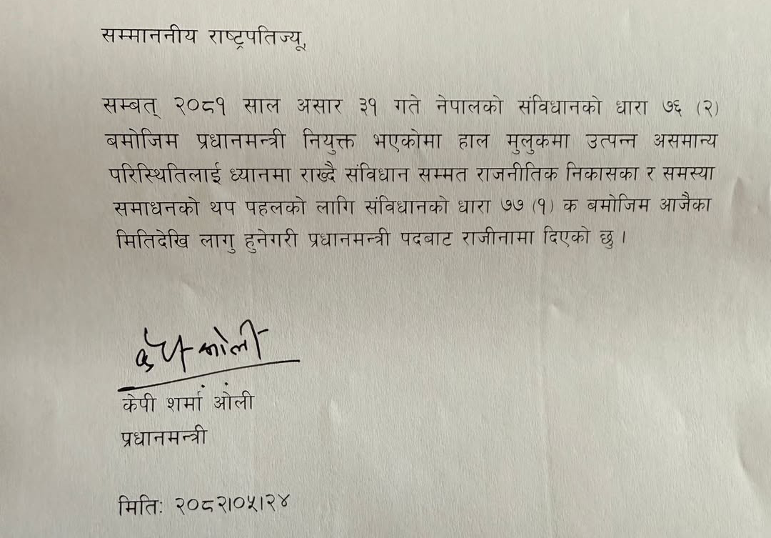 काठमाडौं २४ भदौ ।एबीसी टिप्पणीः प्रधानमन्त्री केपी शर्मा ओलीले पदबाट राजीनामा दिएका छन् । उनले पदबाट दिएको सचिवालयले जानकारी गराएको छ ।