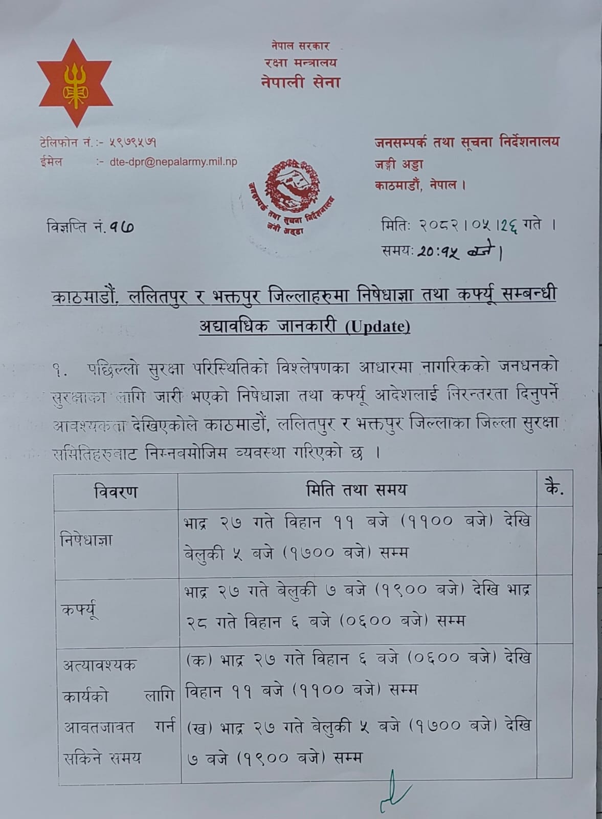 सेनाको मुख्यालय जंग्गीअड्डाले जारी गरेको विज्ञप्ति अनुसार, भोलि (भदौ २७) गते बिहान ११ बजेबाट बेलुकी ५ बजेसम्म निषेधाज्ञा लाग्नेछ । त्यस्तै, साँझ ७ बजेबाट रातभर कर्फ्यू आदेश जारी गरिएको छ ।