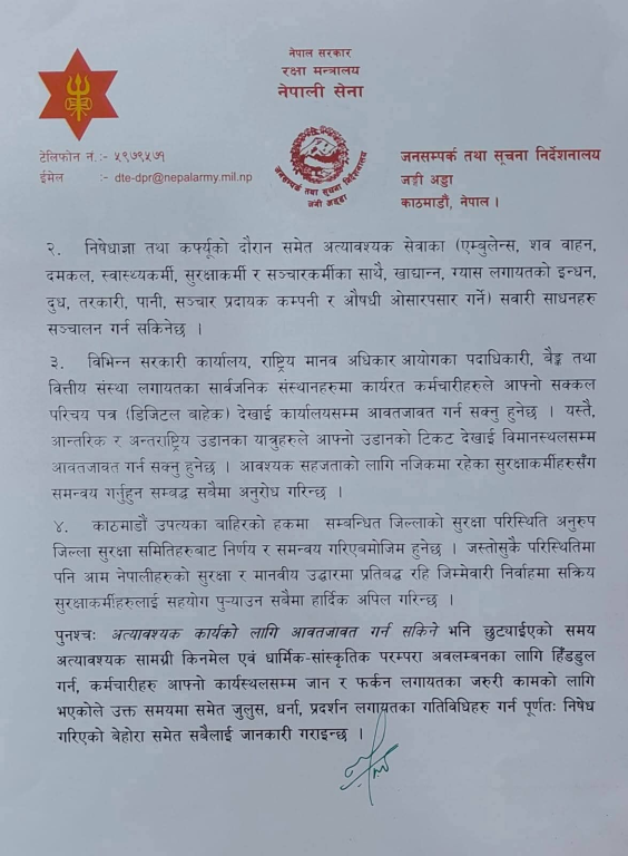 बिहान ६ देखि ११ बजे र साँझ ५ देखि ७ बजेसम्मको समयमा भने अत्यावश्यक कार्यका लागि आवतजावत गर्न सकिने नेपाली सेनाले विज्ञप्तिमार्फत जनाएको छ ।