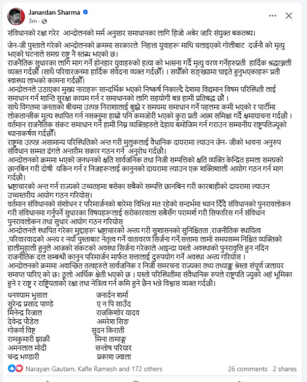 राष्ट्रमा उत्पन्न असामान्य परिस्थितिको अन्त गरी मुलुकलाई वैधानिक दायरामा ल्याउन जेन९ जीको भावना अनुरुप संविधान सम्मत ढंगले अन्तरीम सकार गठन गर्न अनुरोध गर्दछौँ।