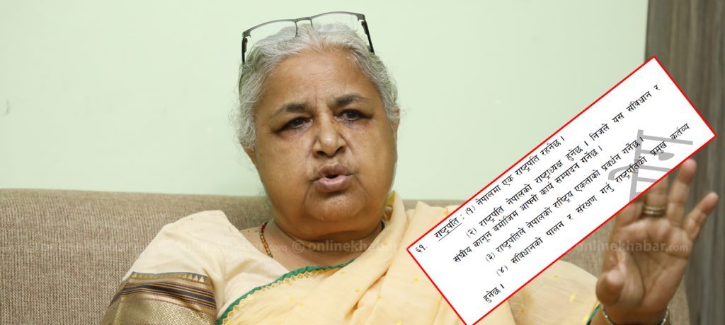 राष्ट्रपतिले नेपालको राष्ट्रिय एकताको प्रवर्द्धन गर्नेछ अनि संविधानको पालन र संरक्षण गर्ने व्यवस्था पनि सोही धारामा छ ।