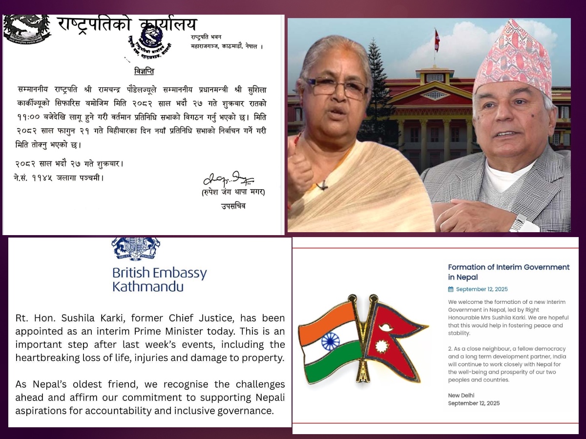 काठमाडौं २७ भदौ । राष्ट्रपति रामचन्द्र पौडेलले नवनियुक्त प्रधानमन्त्री सुशीला कार्कीको सिफारिसका आधारमा प्रतिनिधिसभा विघटनको निर्णय गरेका छन् । प्रधानमन्त्री नियुक्त भएकी कार्कीले आफ्नो पहिलो निर्णयमै प्रतिनिधिसभा विघटन गर्न सिफारिस गरेकी थिइन् ।