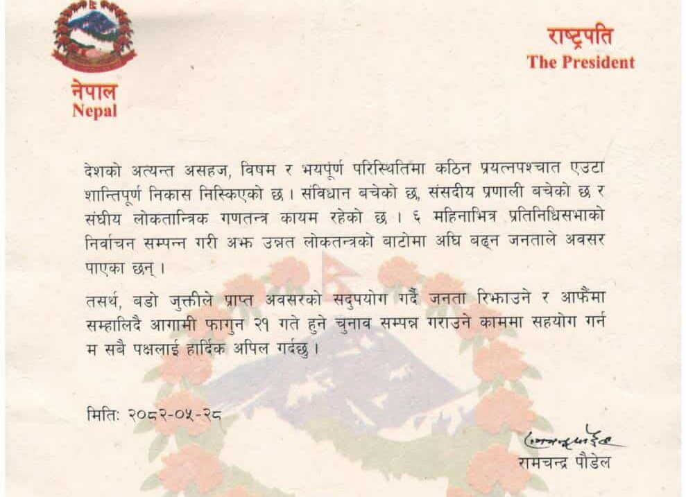 तर, शनिबार राष्ट्रपति पौडेलले परिस्थितिअनुरुप शान्तिपूर्ण निकास निस्किएको अवस्थामा प्रतिनिधि सभा विघटनको निर्णय स्वीकारेर निर्वाचन गराउन सबैलाई सहयोग गर्न अपील गरेका हुन् ।