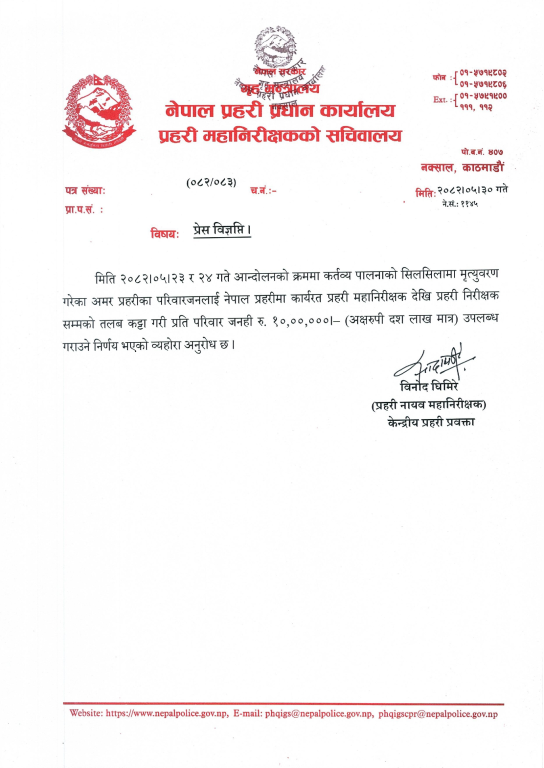 आन्दोलनका क्रममा ज्यान गुमाएका व्यक्तिका परिवारलाई क्षतिपूर्तिबापत १० लाख र अन्य खर्च ५ लाख गरी कुल १५ लाख रुपैयाँ क्षतिपूर्ति उपलब्ध गराउने निर्णय भएको गृह तथा कानुनमन्त्री ओमप्रकाश अर्यालले जानकारी दिए ।