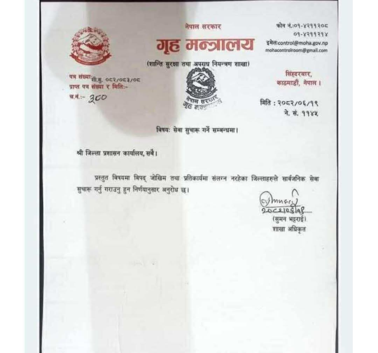 गृहको निर्देशन– विपद्जन्य अवस्था नभएका जिल्लामा सेवा नरोक्नू, सोमबार बिदा छैन