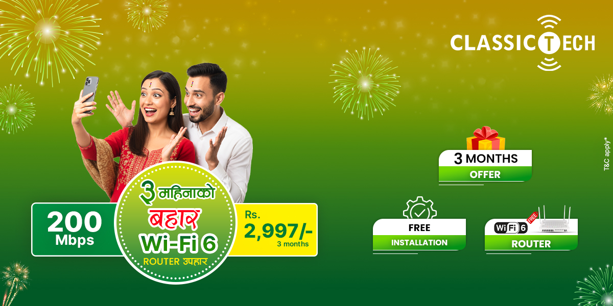 काठमाडौं, २४ असोज । इन्टरनेट सेवा प्रदायक कम्पनि क्लासिक टेकले तिहार विशेष अफर सार्वजनिक गरेको छ। अब ग्राहक हरुले २०० एम बि पी एस इन्टरनेट मात्र रू। २९९७ तीन महिनाको लागि जडान गर्न सक्ने छन्। तिहार लक्षित उक्त अफरमा तीन हजारको इन्टरनेट मा रु ६००० बराबर को फाइदा हुने कम्पनीले बताएको छ । साथै बजारमा ६००० मूल्य पर्ने वाईफाई सिक्स राउटर पनि समावेस छ।