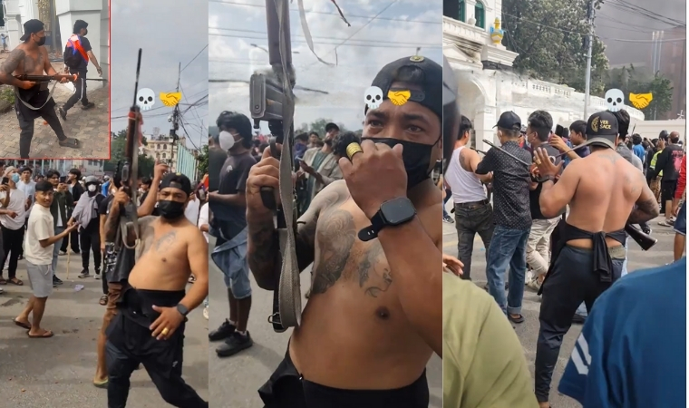 उनले एसएलआर ‘सेल्फ लोडिङ राइफल’ बोकेर सिंहदरबार मुल गेट अगाडि लगायतका विभिन्न स्थानमा सार्वजनिक सम्पत्ति तोडफोड तथा आगजनी गरी क्षति पुर्याएको प्रहरीले जनाएको छ।
