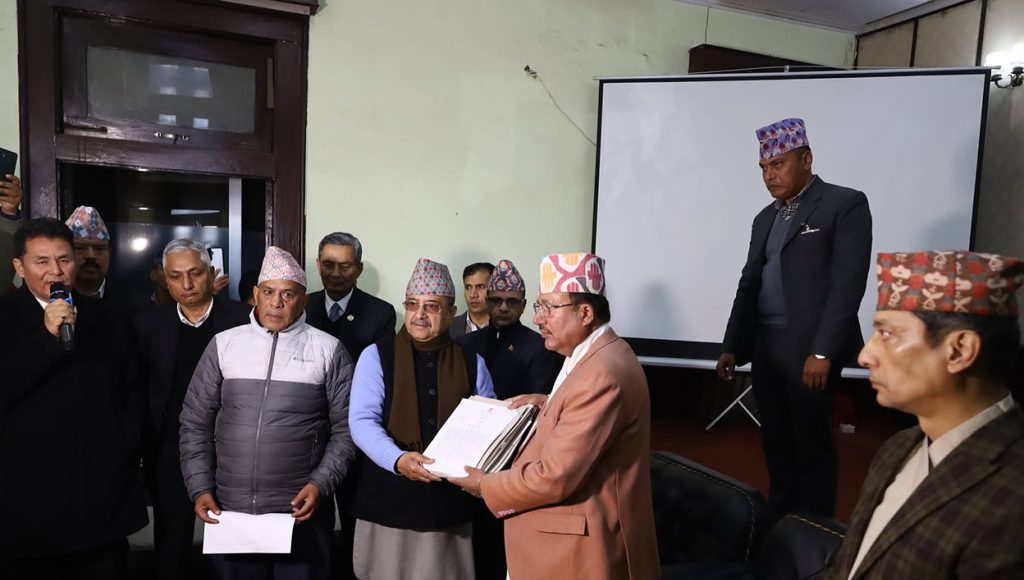 काठमाडौं, २ माघ । शेरबहादुर देउवा नेतृत्वको नेपाली कांग्रेसका कार्यवाहक सभापति पूर्णबहादुर खड्काले गगन थापा नेतृत्वको नेपाली कांग्रेस निर्वाचन आयोग पुग्नुलाई लोकतन्त्रमाथिको षडयन्त्रको संकेतका रूपमा अर्थ्याएका छन् ।पार्टीका पदाधिकारी र केन्द्रीय सदस्यहरूसहित दलबलका साथ शुक्रबार निर्वाचन आयोग पुगेका कार्यवाहक सभापति खड्काले आयोगका पदाधिकारीसामु गगन थापा नेतृत्वको कांग्रेस आधिकारिका लागि पुग्नु लोकतन्त्र माथिको षडयन्त्रको संकेत भएको बताएका हुन् ।‘नेपालको संविधानमाथि, नेपालको लोकतन्त्रमाथि, नेपालको हामीले गरेको परिवर्तनमाथि जुनखालको गम्भीर षडयन्त्रका संकेतहरू देखिन थालेका छन्,’ उनले भने, ‘त्यही षडयन्त्रको ठूलो संकेतको रूपमा निर्वाचन आयोगमा आएर केही व्यक्तिहरूले हामी कांग्रेसको दाबा गर्न आयौं भनेर सञ्चार माध्यमबाट जानकारी पायौं ।’कार्यवाहक सभापति खड्काले १४ औं महाधिवेशनमा निर्वाचित केन्द्रीय कार्यसमिति नै कांग्रेसको आधिकारिक भएको जिकिर पनि गरे ।उनले आधिकारिकता दाबी गर्दै कागजातहरु कार्यवाहक प्रमुख निर्वाचन आयुक्त रामप्रसाद भण्डारीलाई बुझाएका छन् ।