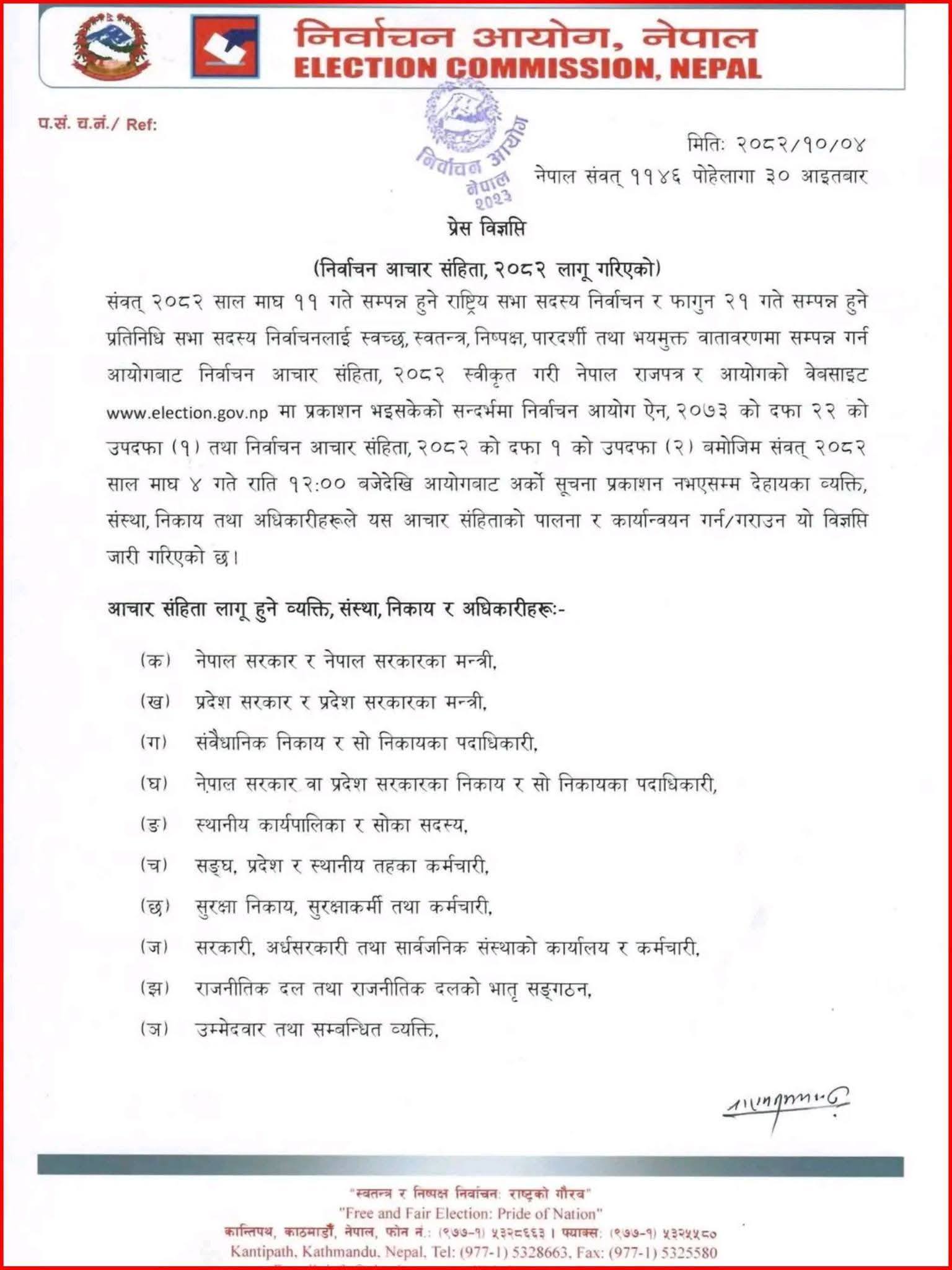 काठमाडौं, माघ ४, २०८२: आगामी फागुन २१ गते (मार्च ५) मा हुने प्रतिनिधिसभा सदस्य निर्वाचनलाई स्वच्छ, निष्पक्ष, पारदर्शी तथा भयमुक्त बनाउन निर्वाचन आयोगले आज राति १२ बजेदेखि निर्वाचन आचारसंहिता, २०८२ लागू गर्ने निर्णय गरेको छ।