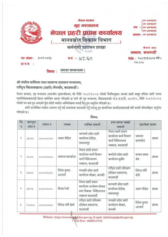 यसैगरी दिपेन्द्र घर्ती क्षेत्री, भुपेन्द्रबहादुर खत्री, माधव प्रसाद श्रेष्ठ र राजेन्द्र प्रसाद भट्टको पनि सरुवा भएको छ ।पौडेललाई प्रहरी प्रधान कार्यालयको कार्यविभाग कार्य निर्देशनालयमा, सापकोटालाई कर्णाली प्रदेशमा, आचार्यलाई प्रहरी प्रशिक्षण प्रतिष्ठान महाराजगञ्जमा र रेग्मीलाई अन्वेषण योजना तथा विकास निर्देशनालयमा सरुवा गरिएको छ ।यसैगरी क्षेत्रीलाई गण्डकी प्रदेश प्रहरी कार्यालय पोखरामा, खत्रीलाई केन्द्रीय अनुसन्धान व्युरो लाजिम्पाटमा, श्रेष्ठलाई कर्णाली प्रदेश प्रहरी कार्यालय सुर्खेतमा र भट्टलाई लुम्बिनी प्रदेश प्रहरी कार्यालय तुलसीपुरमा सरुवा गरिएको छ ।