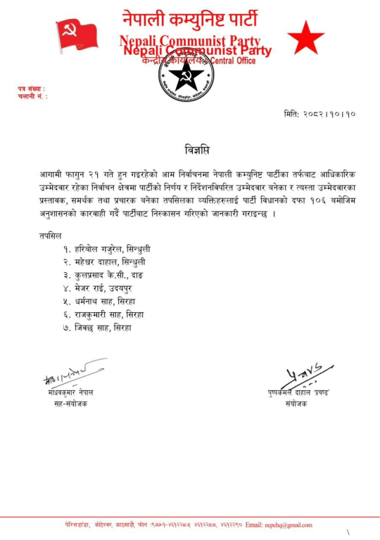काठमाडौं, १० माघ । नेपाली कम्युनिस्ट पार्टी (नेकपा) ले फागुन २१ गते हुने प्रतिनिधिसभा निर्वाचनमा पार्टीको आधिकारिक उम्मेदवारविरुद्ध बागी (विद्रोही) उम्मेदवारी दिने तथा त्यसको समर्थन गर्ने सात जना नेता तथा कार्यकर्तालाई पार्टीबाट निष्कासन गरेको छ। नेकपाका संयोजक पुष्पकमल दाहाल ‘प्रचण्ड’ र सहसंयोजक माधवकुमार नेपालको संयुक्त हस्ताक्षरमा जारी विज्ञप्तिमा यो कारबाहीको घोषणा गरिएको हो। यो कदमले नेकपाभित्रको अनुशासन र निर्वाचनमा एकताको मुद्दालाई कडाइका साथ लागू गरेको देखिन्छ, तर आन्तरिक असन्तुष्टि र विद्रोहलाई पनि उजागर गरेको छ।