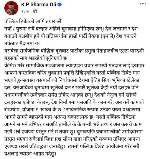उनले लेखेका छन्– यसपालिको निर्वाचनमा देशमा ऐतिहासिक भूमिका खेलेका दल, यसअघिको चुनावमा खुलेको दल र भर्खरै खुलेका केही नयाँ दलहरू पनि प्रधानमन्त्रीको उम्मेदवार समेत तोकेर आएका छन्। देशको नेतृत्व गर्न खोज्ने दलहरूका एजेण्डा के छन्, देश निर्माणमा यसअघि के काम गरे, अब गर्ने कामको रोडम्याप, योजना र खाका के छ रु सार्वजनिक रूपमा उठेका यस्ता प्रश्नहरूमा आमनेसामने बहसको माग अत्यन्त सकारात्मक छ।’