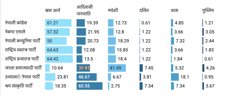 - नेपाली कांग्रेस : खस आर्यलाई ६१.२१ प्रतिशत सिट (जनसंख्याको दोब्बरभन्दा बढी)