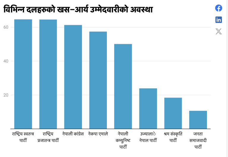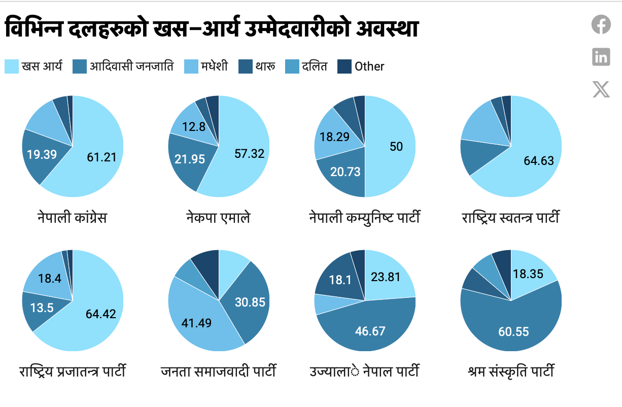 २०८४ को प्रतिनिधिसभा निर्वाचनका लागि दलहरूले प्रत्यक्ष उम्मेदवार छनोट गर्दा खस आर्य समुदायलाई अत्यधिक प्राथमिकता दिएका छन् :
