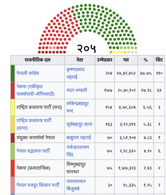 • प्रमुख नतिजा: नेपाली कांग्रेस ११० सिटसहित बहुमत (गिरिजाप्रसाद कोइराला प्रधानमन्त्री)।
