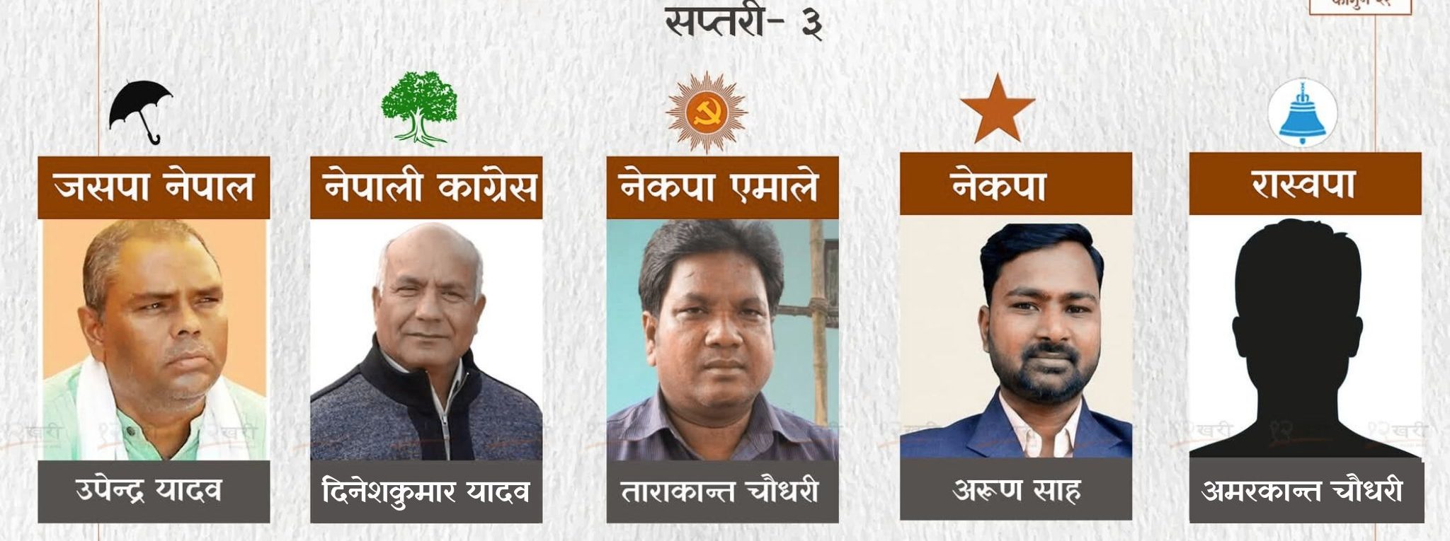 सप्तरी–३ मा कुल २२ उम्मेदवार छन्। जनमत पार्टीका सुरेन्द्र मधेसी, नेकपा (एकीकृत समाजवादी)का अरुणकुमार साह, डा. सन्तोष चमन लगायतका उम्मेदवारले प्रतिस्पर्धालाई बहुकोणीय बनाएका छन्। आठ स्वतन्त्र उम्मेदवारसमेत मैदानमा छन्।