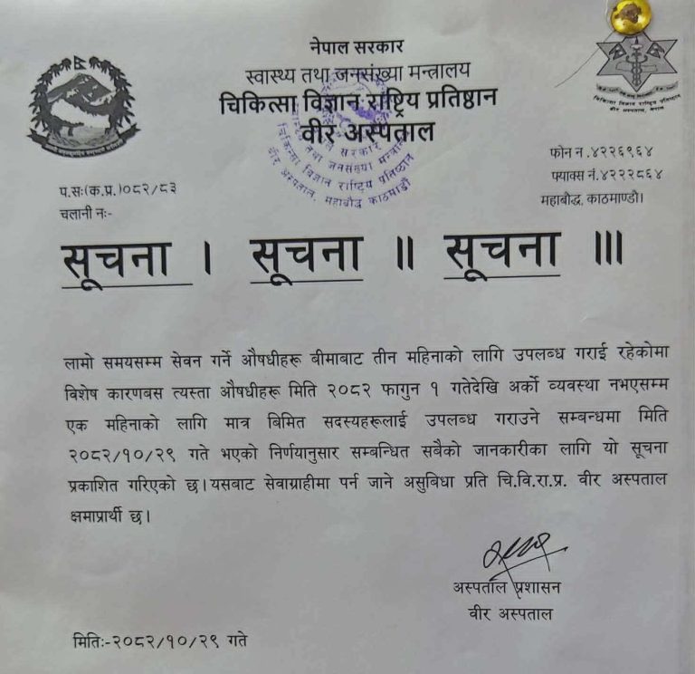 १ फागुन देखि उक्त लागू हुने जनाएको छ । सूचनामा भनिएको छ, ‘१ फागुनदेखि अर्को व्यवस्था नभएसम्म एक महिनाका लागि मात्रै बिमित सदस्यलाई औषधि उपलब्ध गराइने छ ।’ अस्पतालका निर्देशक डा. दिलीप शर्माका अनुसार बीमा बोर्डले लामो समयदेखि भुक्तानी नदिएका कारण सेवा कैटाती गर्नुपरेको हो । बीमा मार्फत ४० करोडभन्दा बढी रकम लिन बाँकी रहेको उनले जानकारी दिए ।‘वीर गरिबको अस्पताल भएकाले सबै बन्द गर्दा बिरामी मारमा पर्छन् । अहिले आर्थिक दायित्व कम गर्नका लागि सेवा थोरै कटौती गरेका हौं’ डा. शर्माले भने ।