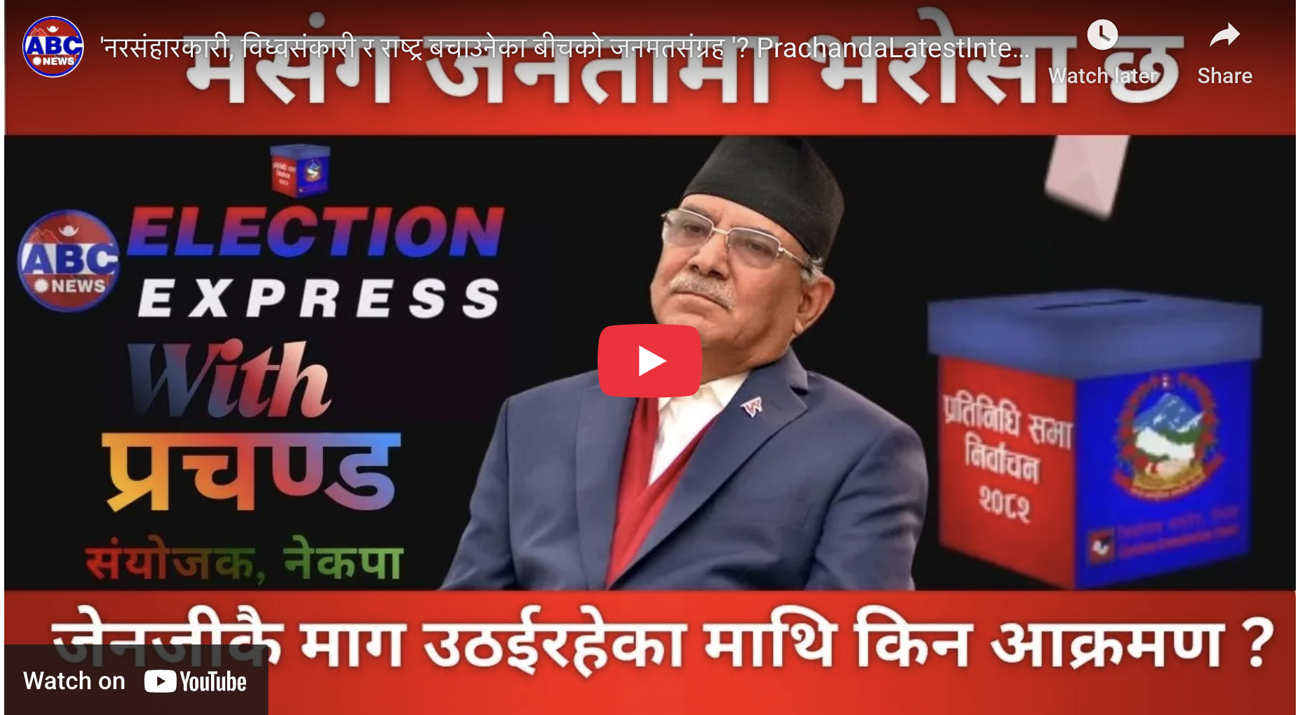 प्रचण्डले भिडियो वार्तामा भने, ‘यो चुनाव २३ गतेका नरसंहारकारी (जसले २०२३ मा हिंसात्मक आन्दोलन गरे), २४ का विध्वंसकारी (जसले संविधान र संस्थाहरू ध्वस्त पार्ने प्रयास गरे) र देश सम्हाल्ने शक्तिबीचको स्पष्ट जनमतसंग्रह हो । जनताले अब कुन बाटो रोज्छन् भन्ने निर्णायक क्षण हो यो ।’