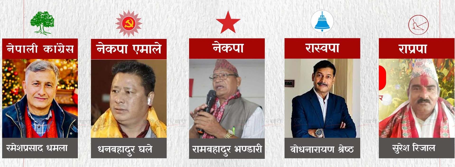 • प्रमुख उम्मेदवारहरू : रमेशप्रसाद धमला (नेपाली कांग्रेस), धनबहादुर घले (नेकपा एमाले), रामबहादुर भण्डारी (नेकपा), बोध नारायण श्रेष्ठ(रास्वपा ), वीरबहादुर तामाङ (प्रलोप/आँखा चिन्ह) लगायत ।
