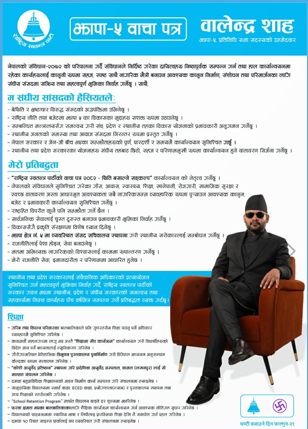 झापा । बालेन्द्र शाह ‘बालेन’ ले झापा जिल्ला–५ बाट प्रतिनिधि सभा सदस्य उम्मेदवारका रूपमा आफ्नो विस्तृत चुनावी वाचापत्र सार्वजनिक गरेका छन्। राष्ट्रिय स्वतन्त्र पार्टी (रास्वपा) को ‘वाचापत्र २०८२ : थिति बसाल्ने संकल्प’ कार्यान्वयनमा आफू अग्रसर रहने प्रतिबद्धता जनाउँदै उनले सुशासन, सेवा प्रवाह, विकास र पारदर्शितालाई प्राथमिकता दिने बताएका छन्।