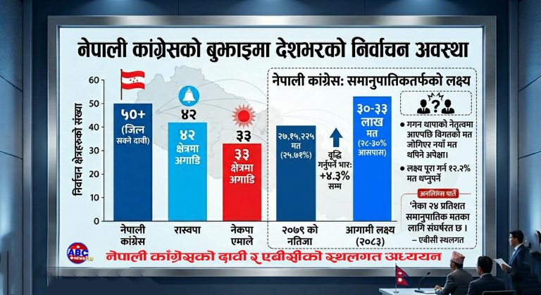 - यसपटकको लक्ष्य: ३०–३३ लाख मत (२८–३०% आसपास) विशेष महाधिवेशनपछि गगन थापाको नेतृत्वमा आएपछि विगतको मत जोगिएर नयाँ मत थपिने अपेक्षा। लक्ष्य पूरा गर्न १२.२% मत थप्नुपर्ने (२०१५ सालको ३७.२% र २०४८ को ३७.७५% जस्तो रेकर्ड ब्रेक सम्भव छैन, तर ३० लाखभन्दा बढी सम्भव छ)। एबीसी स्थलगत नेका २४ प्रतिशत समानुपातिक मतका लागि संघर्षरत छ ।