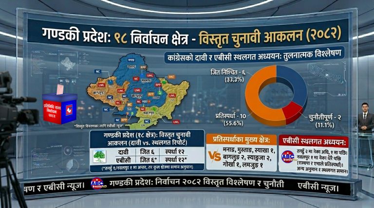 - गण्डकी प्रदेश (१८ क्षेत्र): ६ क्षेत्रमा जित निश्चित मनाङ, मुस्ताङ, स्याङ्जा १, बागलुङ १, तनहुँ १, नवलपुर १ बाँकी क्षेत्रमा तीव्र प्रतिस्पर्धा। (एबीसी स्थलतगतमा (तनहुँ २ मा नेका अघि छ भने तनहुँ १ मा पछि छ, नवलपुर १ मा त नेका धेरै पछि छ, त्यो क्षेत्रमा रास्वपा र एमाले जित निकाल्ने प्रतिस्पर्धामा छन्, अन्य नेकाको दावी र एबीसीको स्थलगत मिलेको छ ।)
