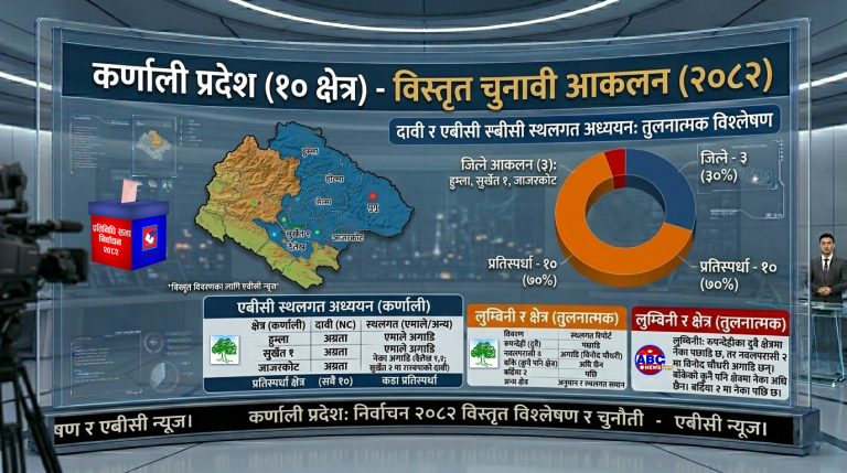 - कर्णाली प्रदेश (१० क्षेत्र): ३ क्षेत्रमा जित्ने आकलन हुम्ला, सुर्खेत १, जाजरकोट सुर्खेत २, दैलेख १,२, डोल्पा, मुगु, सल्यान, कालिकोट, जुम्लामा प्रतिस्पर्धा। एबीसी स्थलगत, यो प्रदेशमा नेकाले दावी गरेका रुपन्देहीका दुवै क्षेत्रमा नेका पछाडि छ, तर नवलपरासी २ मा नेकाका विनोद चौधरी अगाडि छन्, बांकेको कुनै पनि क्षेत्रमा नेका अघि छैन भने, बर्दिया २ मा पनि नेका पछि छ ।अन्य क्षेत्रको अनुमान र हाम्रो स्थलत समान छ ।