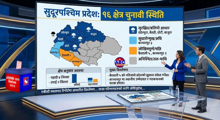 - सुदूरपश्चिम प्रदेश (१६ क्षेत्र): ६ क्षेत्रमा जित्ने आधार कैलाली ५, कञ्चनपुर २, डडेल्धुरा, बैतडी, डोटी, बाजुरा बाँकी क्षेत्रमा अवस्था तल–माथि। (एबीसी स्थलगत, कैलाली ५ मा पछि, कन्चनपुर २ मा पछि तर ३ मा अघि)
