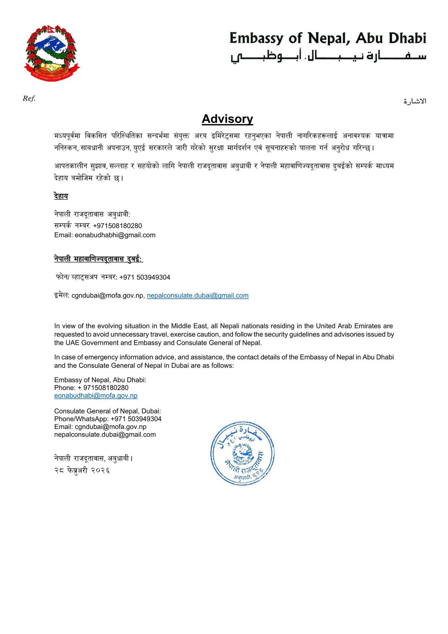 काठमाडौं । संयुक्त अरब इमिरेट्स (यूएई) मा रहेका नेपाली नागरिकलाई अनावश्यक यात्रा नगर्न त्यहाँस्थित नेपाली दूतावास अबुधाबीले आग्रह गरेको छ। मध्यपूर्व क्षेत्रमा विकसित भइरहेका पछिल्ला परिस्थितिलाई ध्यानमा राख्दै दूतावासले उच्च सतर्कता अपनाउन अनुरोध गरेको हो।