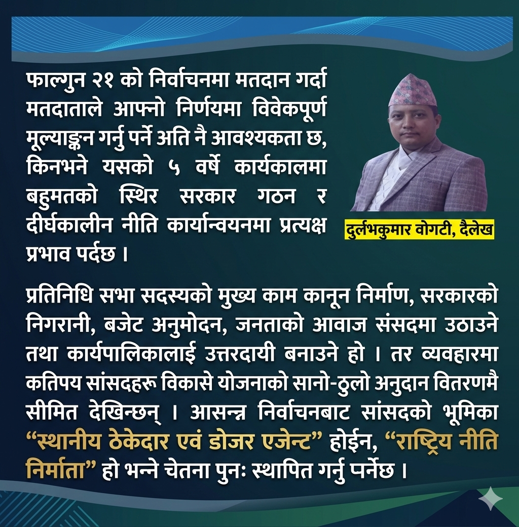 प्रतिनिधि सभा सदस्यको मुख्य काम कानून निर्माण, सरकारको निगरानी, बजेट अनुमोदन, जनताको आवाज संसदमा उठाउने तथा कार्यपालिकालाई उत्तरदायी बनाउने हो । तर व्यवहारमा कतिपय सांसदहरू विकासे योजनाको सानो–ठुलो अनुदान वितरणमै सीमित देखिन्छन् । विगतका माननीयहरुको उपस्थिती र सहभागिता हेर्दा नीति निर्माण र प्रभावकारी संसदीय बहसमा सक्रियता अपेक्षित स्तरमा पुगेको देखिदैन । आसन्न निर्वाचनबाट सांसदको भूमिका “स्थानीय ठेकेदार एवं डोजर एजेन्ट” होईन, “राष्ट्रिय नीति निर्माता” हो भन्ने चेतना पुनःस्थापित गर्न अत्यन्तै आवश्यक छ ।