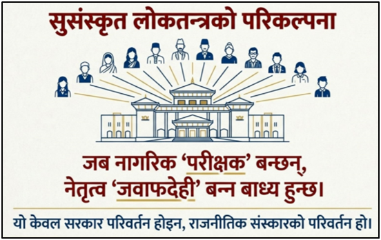 नागरिक केवल मतदाता मात्र नभई सक्रिय परीक्षक र परीक्षणकर्ता बन्न सके लोकतन्त्र जीवन्त र उत्तरदायी बन्नेछ । यदि नागरिकले आफ्नो अधिकार र जिम्मेवारीलाई बुझेर निर्णय लिन सके, नियमित अनुगमन गर्न थाले र पारदर्शिता कायम राख्न पहल गरे भने राजनीतिक दल, नेतृत्व र सरकारी निकायहरू स्वतः जवाफदेही बन्न बाध्य हुन्छन् । यसले नेपालको लोकतान्त्रिक अभ्यासमा नागरिक–प्रतिनिधि सम्बन्धलाई मजबुत बनाउने, भ्रष्टाचार घटाउने र नीति–निर्णयको गुणस्तर सुधार्ने प्रभावकारी वातावरण तयार गर्नेछ ।