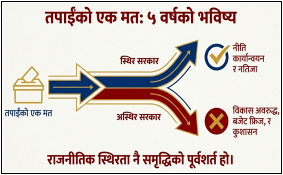 आसन्न निर्वाचनमा मतदान गर्दा मतदाताले आफ्नो निर्णयमा विवेकपूर्ण मूल्याङ्कन गर्नु पर्ने अत्यन्तै आवश्यकता छ, । यसले अबको ५ वर्षे कार्यकालमा बहुमतको स्थिर सरकार गठन र दीर्घकालीन नीति कार्यान्वयनमा प्रत्यक्ष प्रभाव पर्नेछ । विगतका अनुभवहरूले देखाएका छन् कि अस्थिर गठबन्धन, अल्पकालीन सरकार परिवर्तन र दलगत विवादहरूले विकास योजना कार्यान्वयन, बजेट व्यवस्थापन, सुशासन र विकास प्राथमिकतामा अवरोध ल्याएका छन् । यसले गर्दा पनि मतदातालाई निष्पक्ष मूल्याङ्कन र विवेक प्रयोग गर्नु पर्ने कुराको आवश्यकता झन् बढाएको छ ।