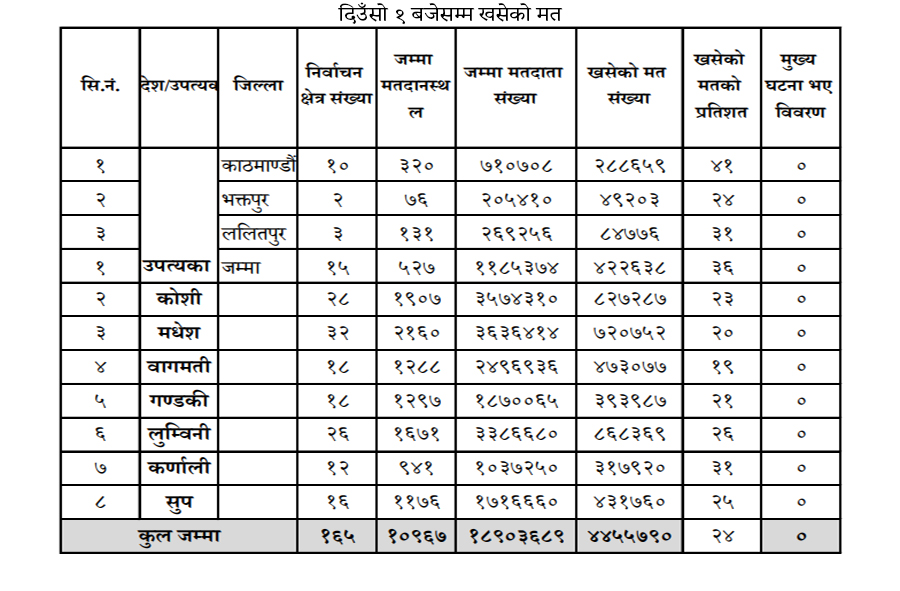 दिउँसो १ बजेसम्म देशभर ४४ लाख ५५ हजार ७९० मत खसे: कुन प्रदेशमा कति प्रतिशत ?