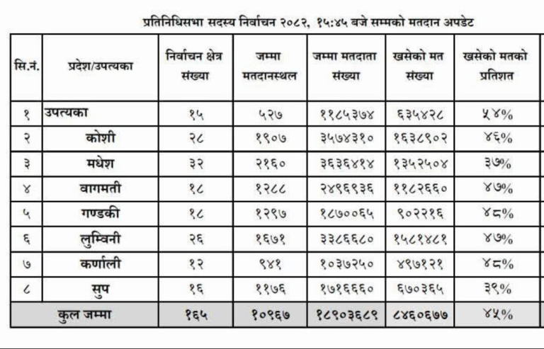 काठमाडौँ — प्रतिनिधिसभा सदस्य निर्वाचनमा मतदान प्रक्रिया अन्तिम चरणमा पुगेको छ। प्राप्त अद्यावधिक तथ्यांक अनुसार दिउँसो करिब ४ बजेसम्म देशभर ४५ प्रतिशत मत खसेको छ। कुल १ करोड ८९ लाख ३ हजार ६ सय ८९ मतदाता मध्ये ८४ लाख ६० हजार ६ सय ७७ जनाले मताधिकार प्रयोग गरिसकेका छन्।