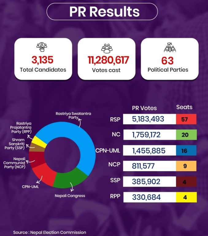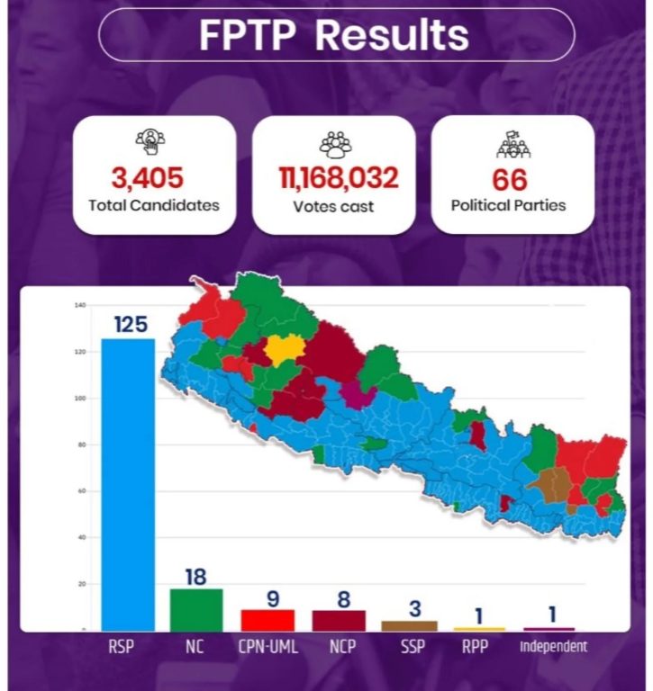 Kathmandu : For the first time since the promulgation of the Constitution, the Rastriya Swatantra Party (RSP) has become the first party to secure a clear single-majority opportunity to form a government. While 138 seats are required for a majority, the people have given RSP a total of 182 seats through direct and proportional representation — marking a historic shift in Nepali politics.
