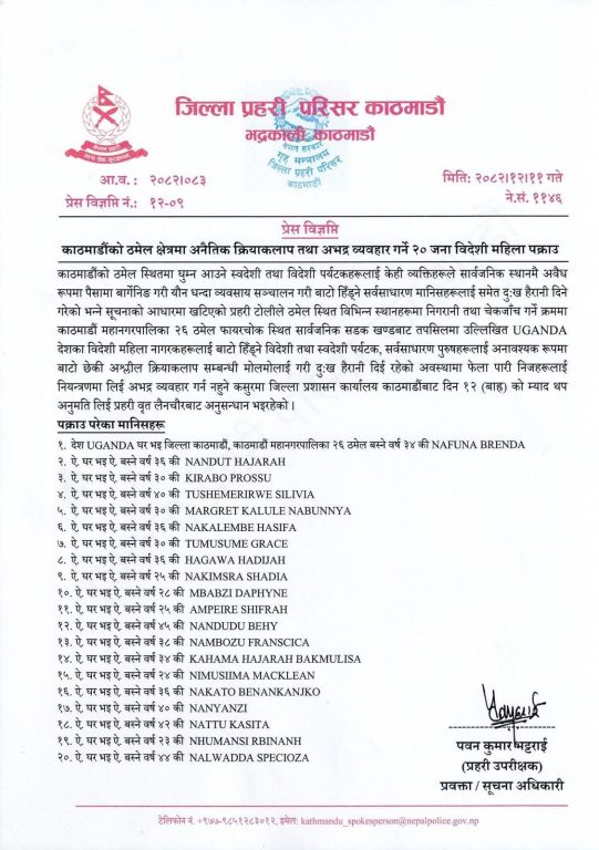 काठमाडौँ, ११ चैत। काठमाडौंको ठमेलबाट २० जना विदेशी महिलाहरू पक्राउ परेका छन् ।ठमेल क्षेत्रमा अनैतिक क्रियाकलाप तथा अभद्र व्यवहार गर्ने २० जना युगान्डाका महिलाहरू पक्राउ परेको जिल्ला प्रहरी परिसर, काठमाडौंका एसपी पवन भट्टराईले जानकारी दिए ।