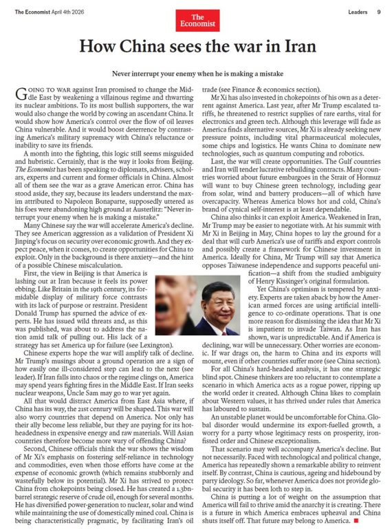 बेइजिङ सोच्छ कि अमेरिका इरानमाथि आक्रमण गर्नुको कारण उसलाई आफ्नो शक्ति घट्दै गएको महसुस भएको छ। उन्नाइसौं शताब्दीको ब्रिटेन जस्तै, शक्ति कमजोर हुँदै जाँदा ठूलो सैन्य प्रदर्शन गर्नु सामान्य मानिन्छ। राष्ट्रपति डोनाल्ड ट्रम्पले विशेषज्ञहरूको सल्लाह अस्वीकार गरेका छन् र जंगली धम्की दिइरहेका छन्। उनी युद्धलाई राष्ट्रिय एकता कायम गर्न प्रयोग गर्न चाहन्छन्।