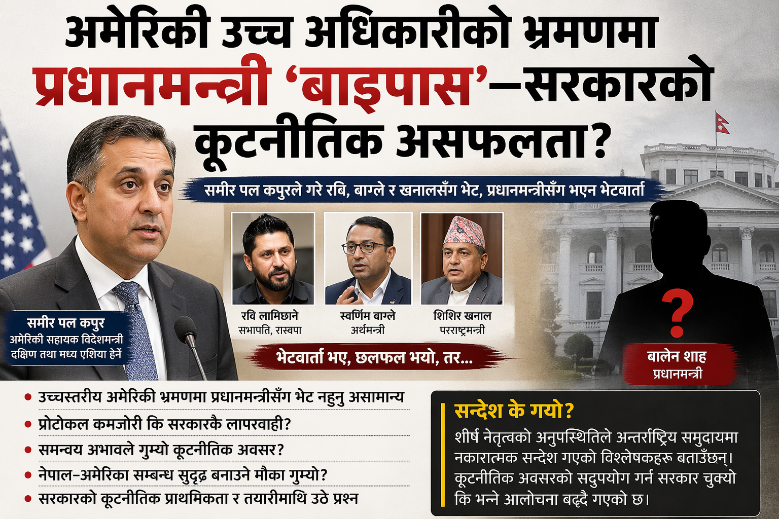 काठमाडौं ९ वैशाख । अमेरिकी उच्च अधिकारी समीर पल कपुरको नेपाल भ्रमणका क्रममा प्रधानमन्त्री बालेन शाहसँग भेट नहुनुले सरकारको कूटनीतिक प्राथमिकता र समन्वयमाथि गम्भीर प्रश्न उठाएको छ। सामान्यतया यस्ता उच्चस्तरीय भ्रमणमा शीर्ष नेतृत्वसँग भेटवार्ता हुने कूटनीतिक अभ्यास भए पनि यसपटक प्रधानमन्त्री ‘बाइपास’ हुनु प्रोटोकल कमजोरी हो कि जानाजानी दूरी राखिएको हो भन्ने बहस सुरु भएको छ। यसले नेपाल–अमेरिका सम्बन्ध सुदृढ बनाउने अवसर गुमेको संकेत दिनुका साथै सरकारभित्रै समन्वय अभाव रहेको सन्देशसमेत दिएको छ। भेट नहुनुले सरकारको कूटनीतिक प्राथमिकता, समन्वय क्षमता र सन्देशप्रेषणमाथि गम्भीर प्रश्न उठाएको छ। प्रायः यस्ता उच्चस्तरीय भ्रमणहरूमा प्रधानमन्त्रीसँग शिष्टाचार भेट अनिवार्यजस्तै मानिन्छ, जसले द्विपक्षीय सम्बन्धको महत्व र आपसी विश्वासको स्तर झल्काउँछ। तर यसपटक त्यो अभ्यास नदेखिनुले प्रोटोकल व्यवस्थापनमै कमजोरी थियो कि राजनीतिक तहबाट जानाजानी दूरी राखिएको हो भन्ने बहस सुरु भएको छ। एकातिर राष्ट्रिय स्वतन्त्र पार्टी नेतृत्वका अन्य शीर्ष नेतासँग भेटघाट हुँदै गर्दा प्रधानमन्त्री नै छुट्नुले सरकारभित्रको आन्तरिक समन्वय, प्राथमिकता निर्धारण र कूटनीतिक तयारीबारे प्रश्न उठाएको छ। यसलाई कतिपयले नेपाल–अमेरिका सम्बन्धमा सन्देशमूलक संकेतका रूपमा पनि व्याख्या गरेका छन् भने कतिपयले यसलाई अवसर गुमेको घटनाका रूपमा हेरेका छन्, जहाँ उच्च तहको प्रत्यक्ष संवादबाट विश्वास निर्माण र रणनीतिक सहकार्यलाई अझ मजबुत बनाउन सकिने सम्भावना थियो। यस्तो अवस्थामा सरकारको कूटनीतिक संयन्त्र कति प्रभावकारी छ, उच्चस्तरीय भ्रमणलाई कसरी व्यवस्थापन गरिन्छ, र अन्तर्राष्ट्रिय सम्बन्धमा नेतृत्वको भूमिका कति प्राथमिकतामा राखिन्छ भन्ने विषय थप चासोको केन्द्रमा आएको छ।