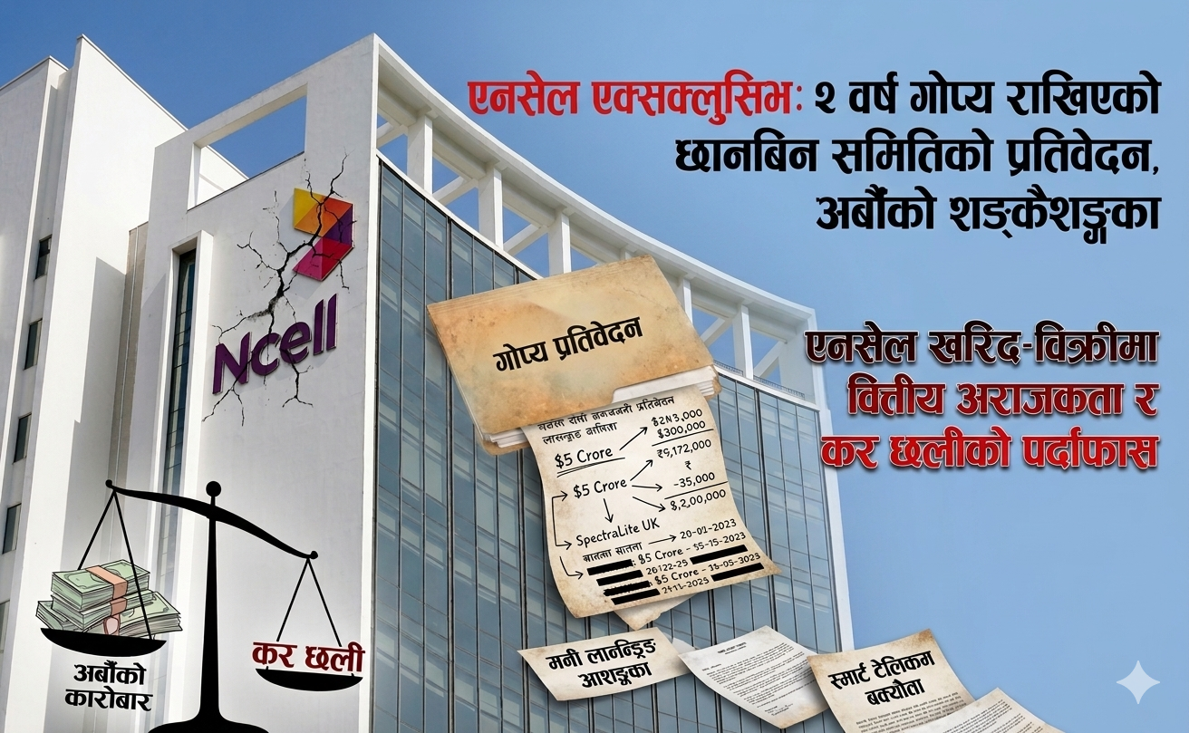 काठमाडौँ : नेपालको दूरसञ्चार इतिहासकै सबैभन्दा विवादास्पद र शङ्कास्पद मानिएको एनसेल शेयर खरिद-बिक्री प्रकरणको नालीबेली अन्ततः बाहिर आएको छ। विगत दुई वर्षदेखि सरकारले मन्त्रिपरिषद्को ‘गोप्य घर्रा’ मा थन्क्याएको छानबिन समितिको प्रतिवेदन टेकपानाले सार्वजनिक गरेको छ । १११ पृष्ठ लामो उक्त दस्तावेजले एनसेलभित्रको वित्तीय अराजकता, वैदेशिक लगानीको नाममा भएको पुँजी पलायन र नियामक निकायको लाचारीलाई छर्लङ्ग पारेको छ।