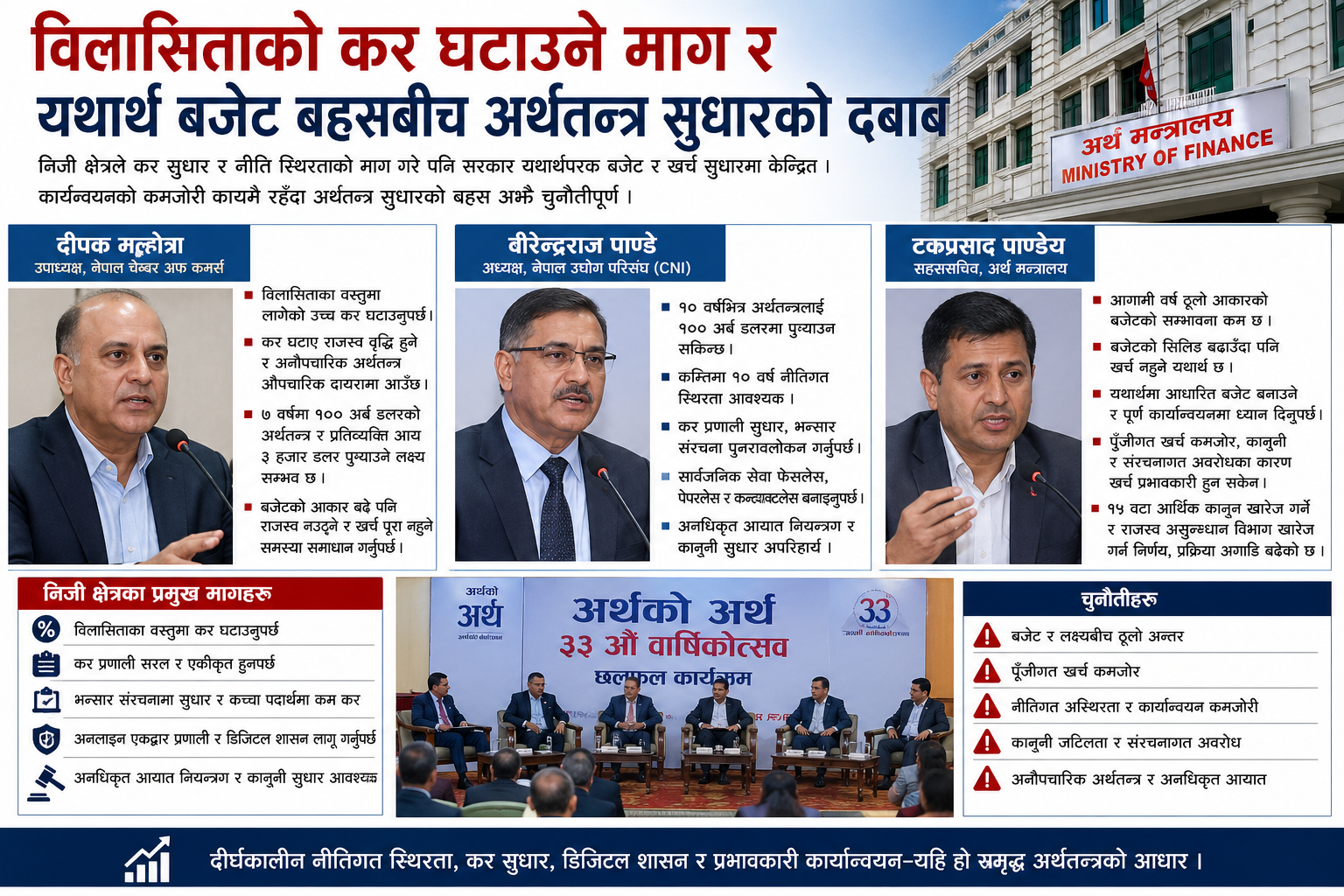 ‘अर्थको अर्थ’ कार्यक्रमको ३३ औं वार्षिकोत्सवमा बोल्दै मल्होत्राले आगामी ७ वर्षमा १०० अर्ब अमेरिकी डलरको अर्थतन्त्र र प्रतिव्यक्ति आय ३ हजार डलर पुर्याउने लक्ष्य सम्भव रहेको बताए पनि यसका लागि स्पष्ट कार्यान्वयन मार्गचित्र र नीतिगत अनुशासनको विषय भने स्पष्ट हुन सकेको छैन। निजी क्षेत्रले निरन्तर कर घटाउने माग गर्दै आएको भए पनि राज्यको राजस्व संरचना र सामाजिक खर्चको दायित्वबीच सन्तुलन कसरी कायम गर्ने भन्ने प्रश्न अझै अनुत्तरित देखिन्छ।
