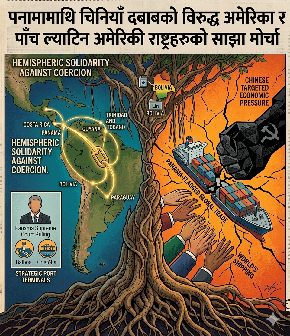 वासिङ्टन डीसी /विश्व व्यापारको लाइफलाइन मानिने पनामा नहर मा चिनियाँ प्रभावलाई लिएर अमेरिका र पाँच ल्याटिन अमेरिकी राष्ट्रहरूले एक दुर्लभ र शक्तिशाली संयुक्त विज्ञप्ति जारी गरेका छन्।